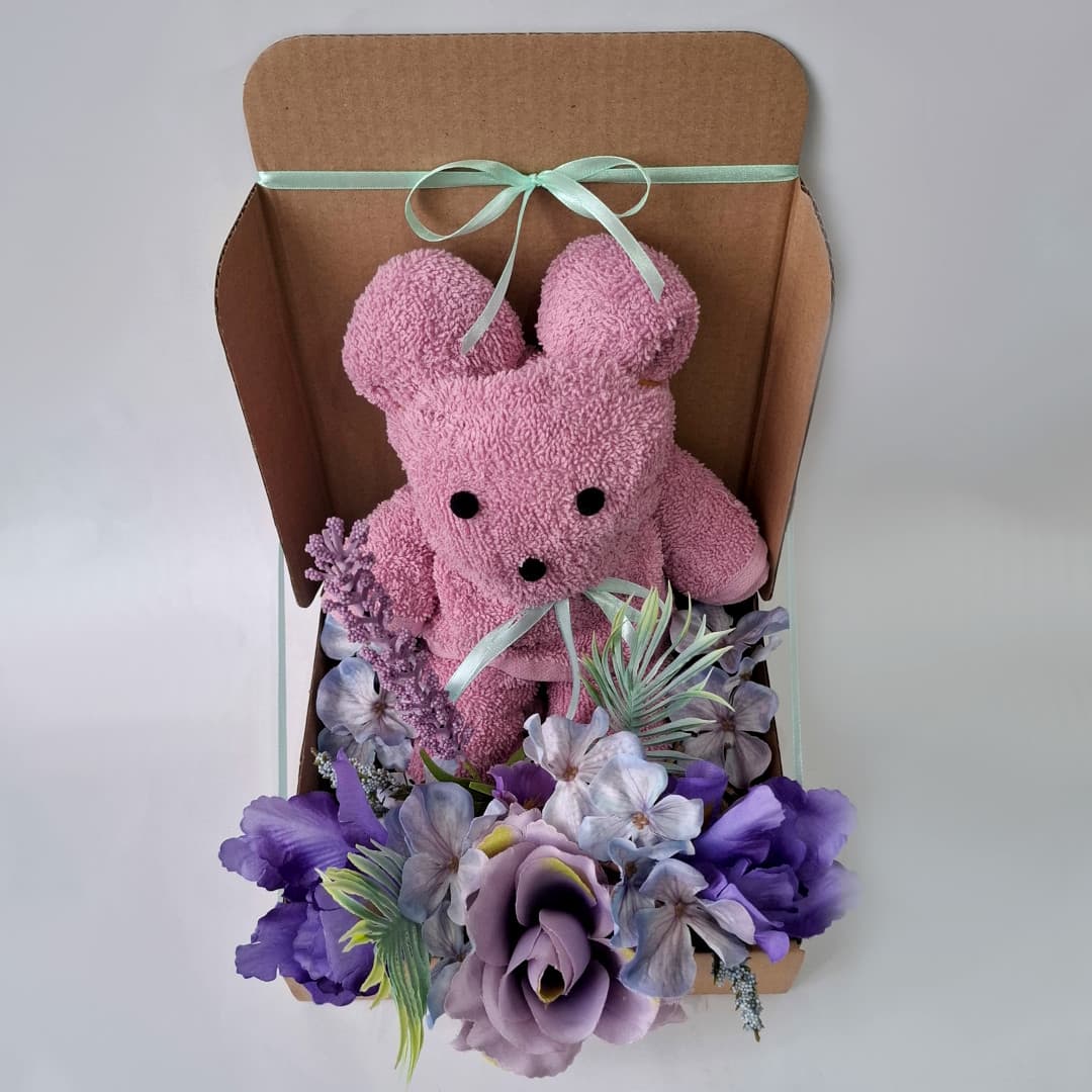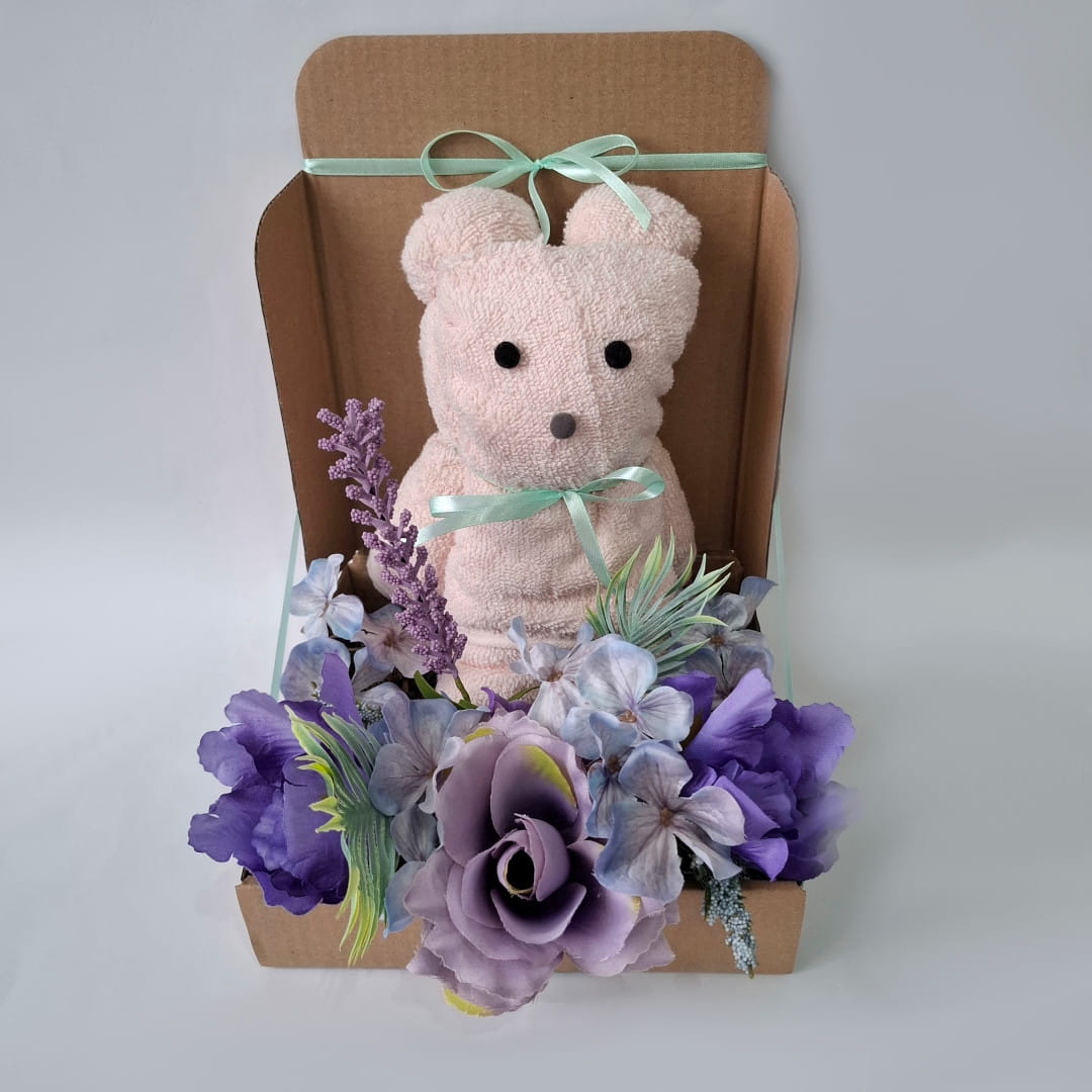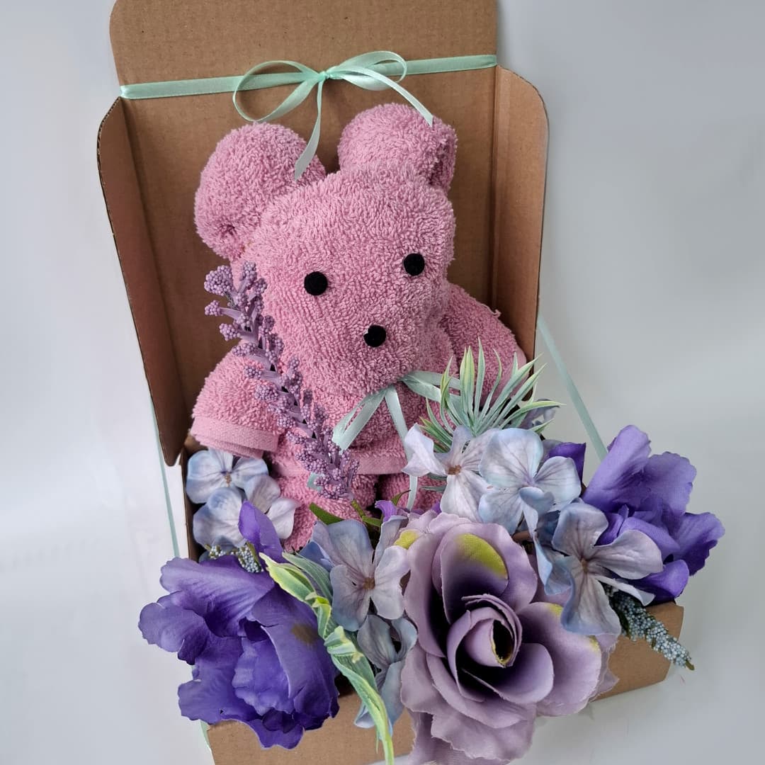 Box prezentowy z ręcznikiem „Miś” - personalizowany, praktyczny i pełen uroku fioletowych kwiatów