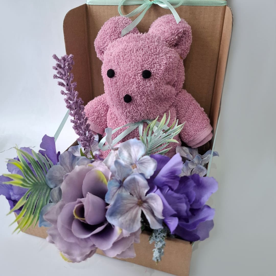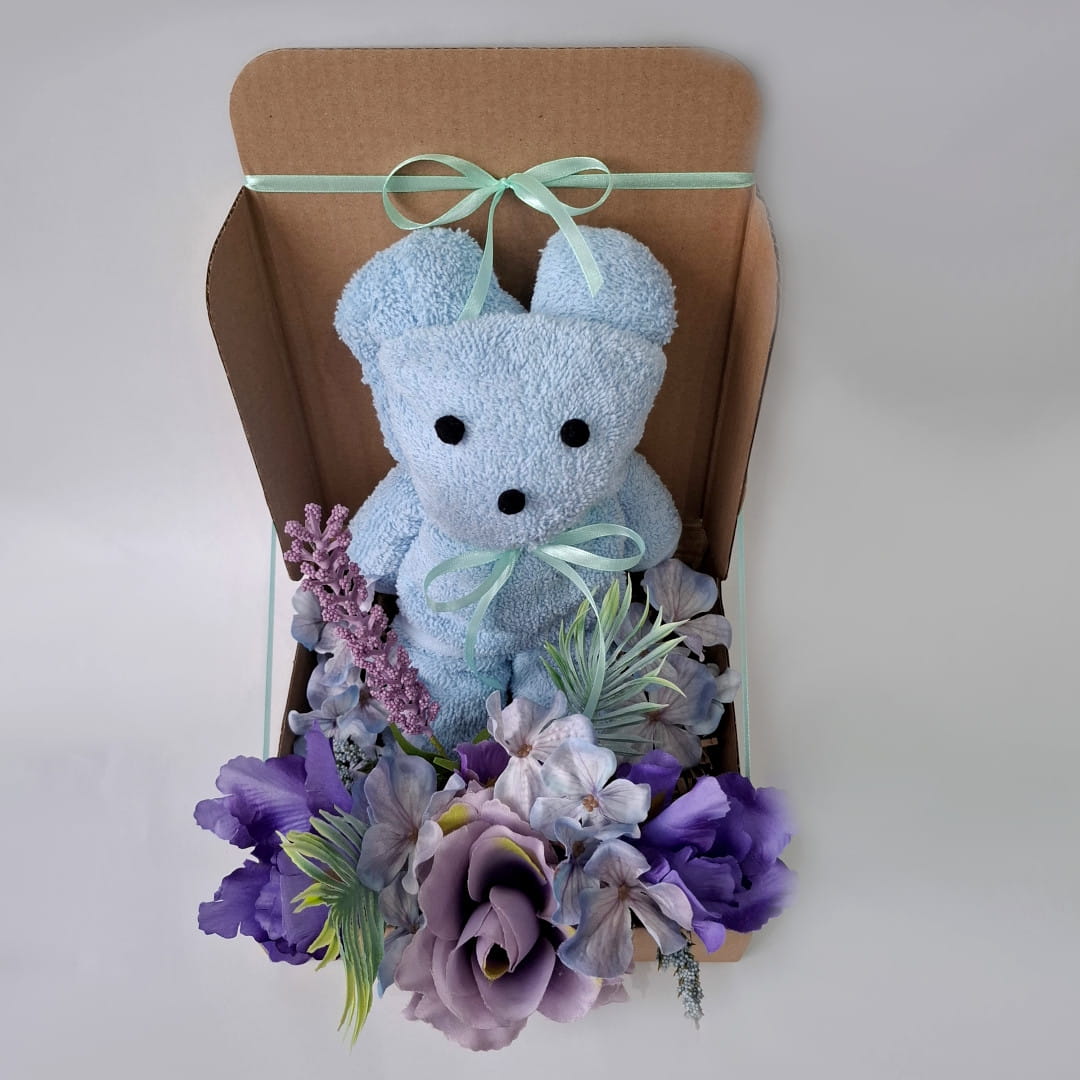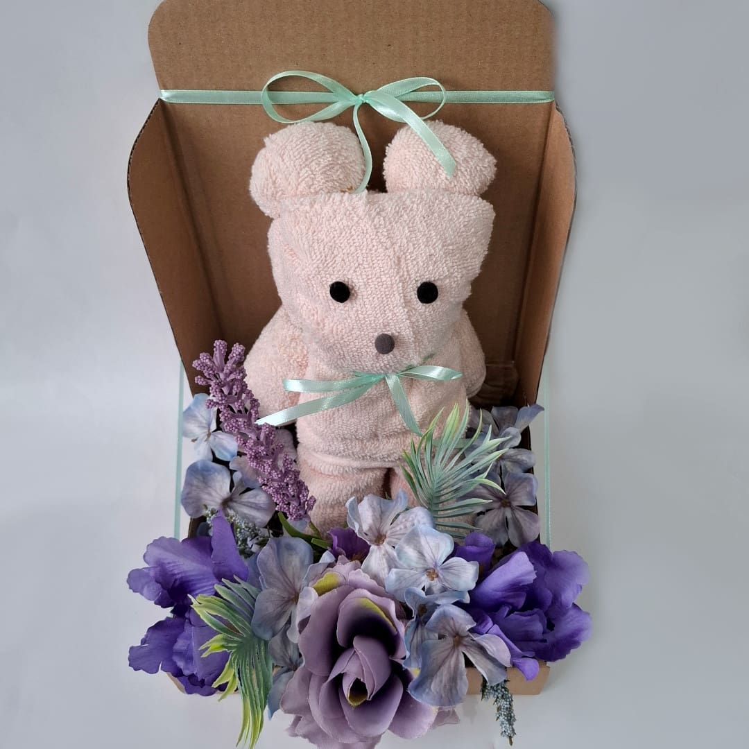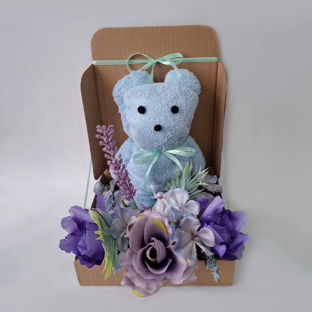 Box prezentowy z ręcznikiem „Miś” - personalizowany, praktyczny i pełen uroku fioletowych kwiatów