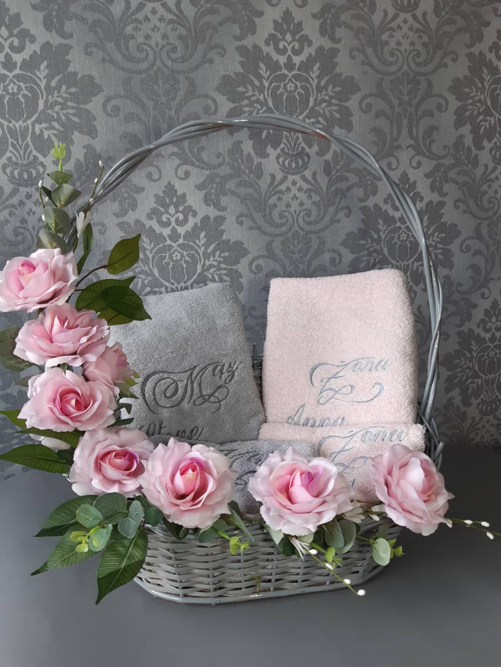 - kosz udekorowany jest kwiatami różowymi, kolorystycznie pasującymi do ręczników