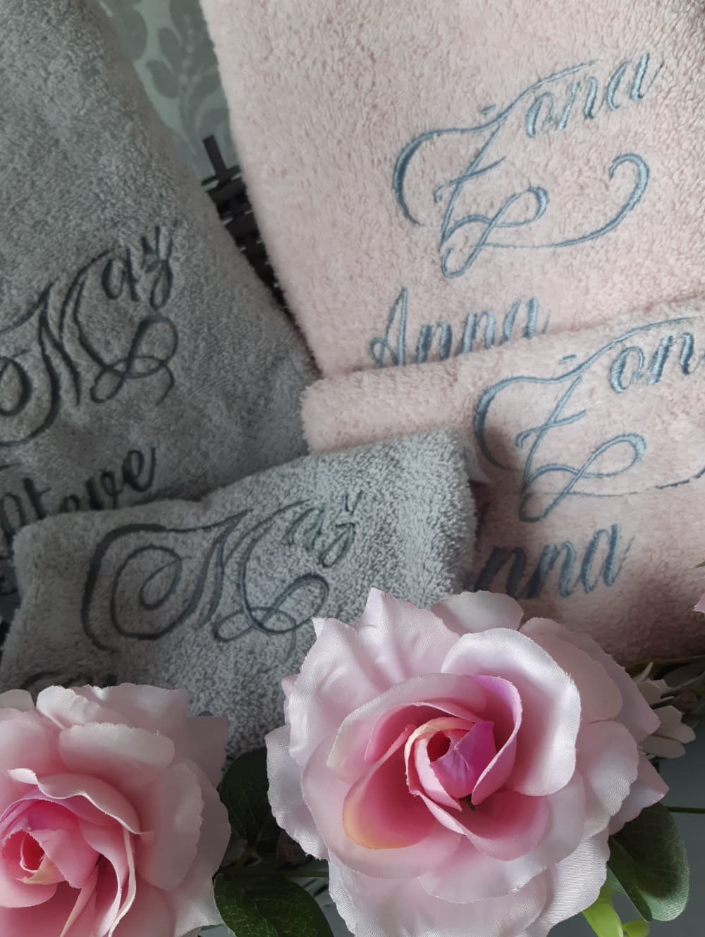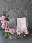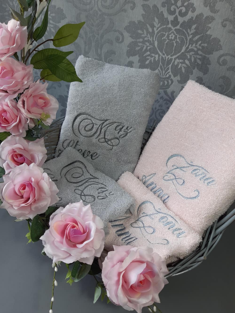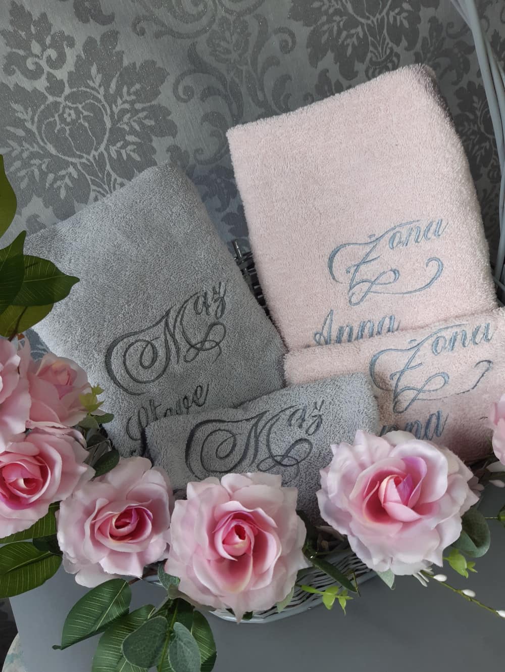 Komplet czterech ręczników (2 w rozmiarze 70x140cm i 2 w rozmiarze 50x100cm) z motywem ślubnym to oryginalny prezent z okazji ślubu lub rocznicy ślubu. Prezent ślubny powinien być wyjątkowy, wszyscy o tym wiemy... więc postaw na indywidualny charakter ręczników z haftowaną dedykacją kierowaną właśnie do konkretnych osób. Takie ręczniki zawsze będą przypominały Ciebie. Zaprojektuj własny haft wg własnego pomysłu. Jak to zrobić? Wybierz kolory ręczników, rodzaj i kolor czcionki, wpisz dedykacje maksymalnie 4 wyrazy (data, w formacie dd.mm.rrrr traktowana jest jak 1 wyraz). Ręczniki są ułożone w szarym koszu w stylu vintage z celowymi przetarciami i jest udekorowany kompozycją kwiatową kolorystycznie dopasowana do ręczników, którą sami dobieramy i komponujemy. Jeśli chcesz zdecydować o kolorystyce kompozycji kwiatowej napisz mi o tym.
