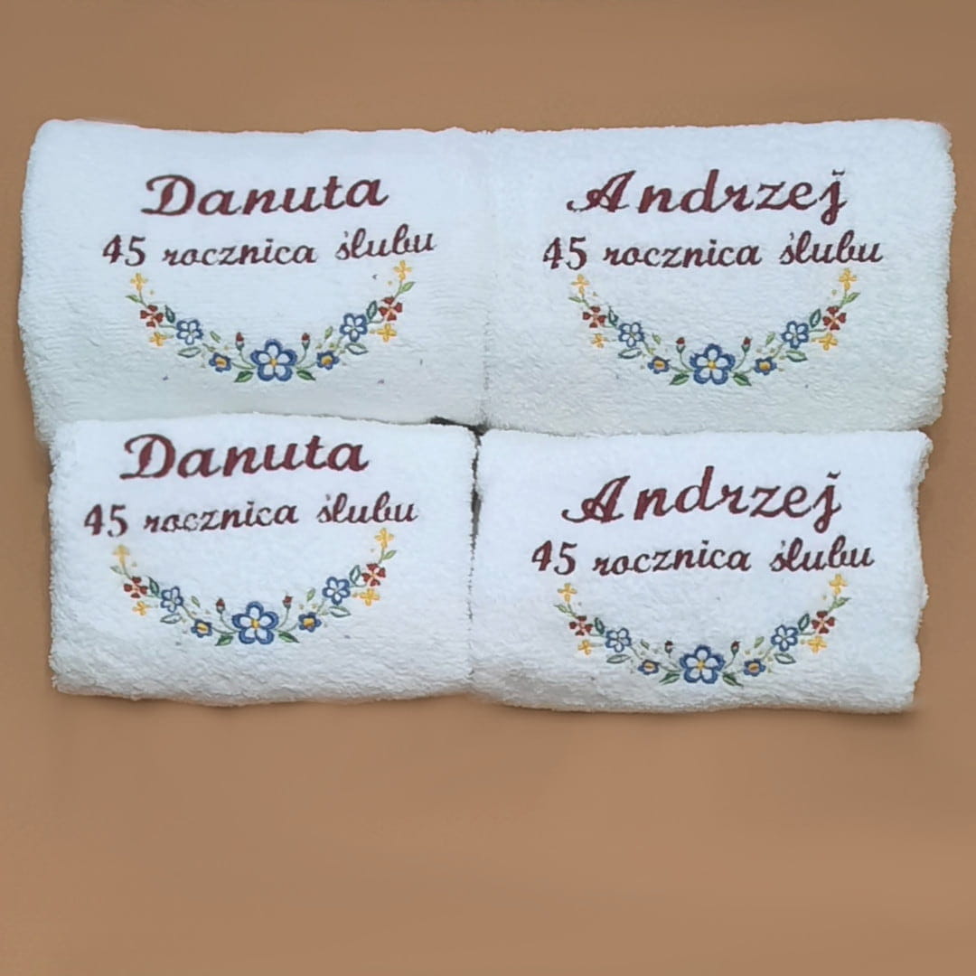 Komplet czterech ręczników (2 x duży, 2 x średni) z motywem folk-kolorowe kwiaty na gałązce, to oryginalny prezent z okazji ślubu lub rocznicy ślubu. Prezent ślubny powinien być wyjątkowy, wszyscy o tym wiemy... więc postaw na indywidualny charakter ręczników z haftowaną dedykacją kierowaną właśnie do konkretnych osób. Takie ręczniki zawsze będą przypominały Ciebie. Zaprojektuj własny haft wg własnego pomysłu. Jak to zrobić? Wybierz kolor i rozmiar ręczników, rodzaj czcionki, kolor haftów, w odpowiednie pola wpisz dedykacje: maksymalnie 3 wyrazy (data w formacie dd.mm.rrrr traktowana jest jak 1 wyraz). Haft na każdym ręczniku.