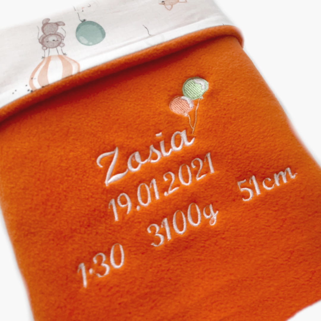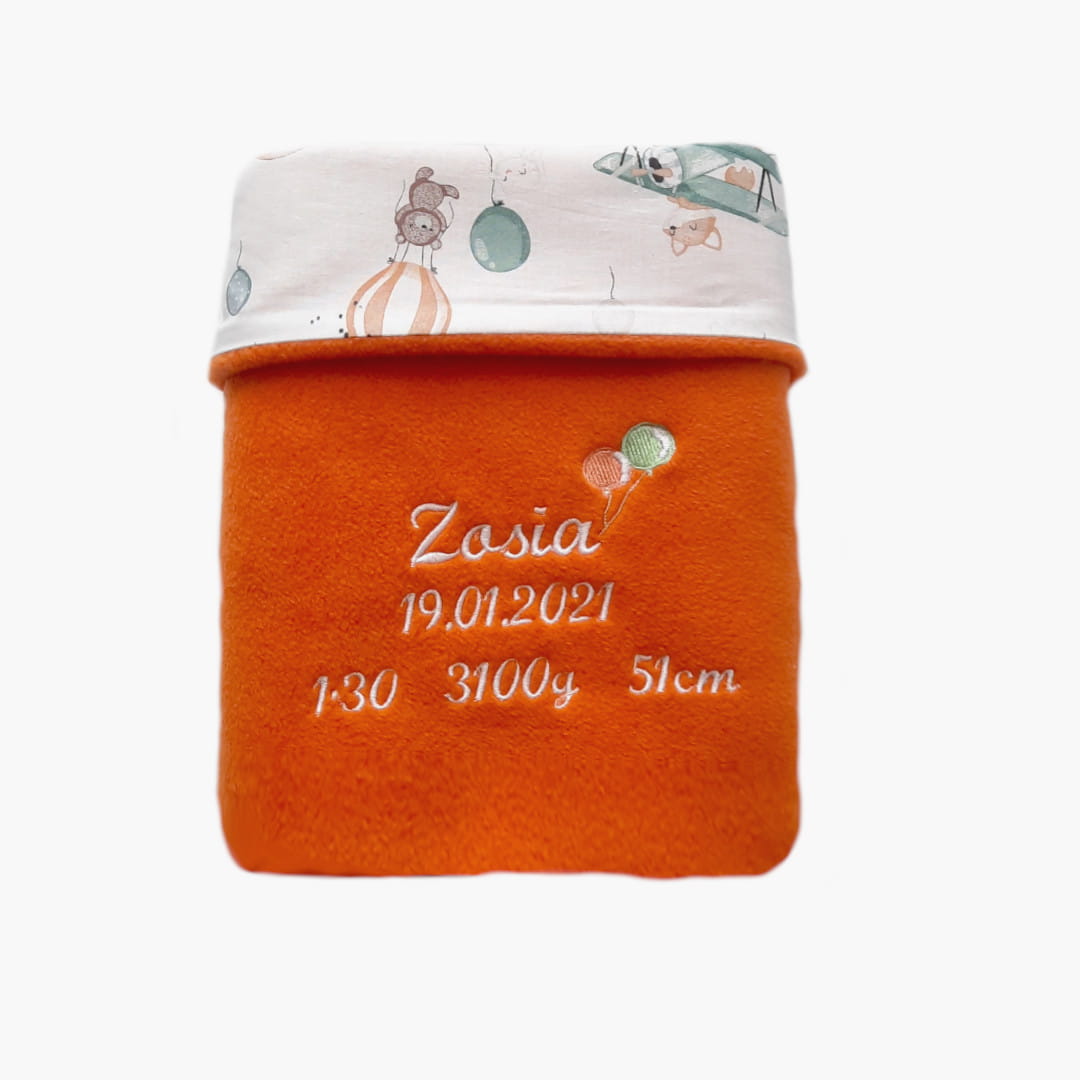 Pomarańczowy kocyk z metryczką, który widzisz na zdjęciu, został wykonany dla Zosi. Piękny, wyrazisty kolor polaru idealnie łagodzony jest przez drukowaną, miłą w dotyku bawełnę. Haftowane obok metryczki baloniki idealnie wpisują się w nadruk z bawełnianej tkaniny i stanowią przemyślaną całość. Kocyk dla dziewczynki lub chłopczyka to fajny, oryginalny prezent na roczek, chrzest, narodziny lub inne święta.