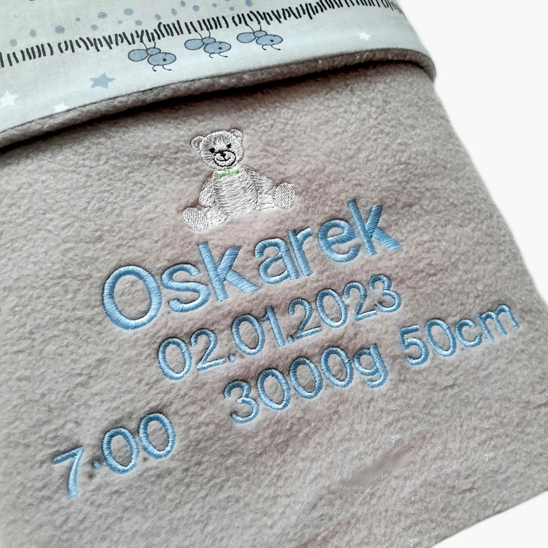 Na zdjęciu widzisz kocyk dla chłopca w szarościach. Kocyk z metryczką dla Oskarka ma 2 warstwy. Spód to bawełna drukowana w dziecięcy wzór, wierzch to szary, miękki w dotyku i praktyczny polar. Na nim wyhaftowana jest metryczka chłopca i motyw szaro-białego misia. Jesteśmy tu dla Ciebie i pamiętaj, że kocyk ten nie jest zarezerwowany wyłącznie dla chłopców. Zmieniając kolorystykę polaru i haftu możesz wykreować kocyk dla dziewczynki. Wykonamy kocyk wg Twoich wytycznych.