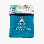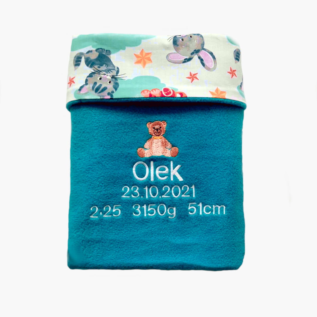 Kocyk z metryczką ma 2 warstwy. Pierwsza-spodnia, to bawełna drukowana w motyw zwierzątek, druga-wierzchnia to miękki w dotyku polar w kolorze turkusu, na którym wyhaftowane jest imię dziecka i jego metryczka. Nad metryczką wyhaftowany jest misiaczek w ciepłych beżowych kolorach. HaftyOK to miejsce kreatywne, dlatego możesz stworzyć własny wariant kocyka z metryczką dla dziecka. Możesz stworzyć kocyk dla własnego dziecka lub na prezent na roczek dla chłopca lub dziewczynki, na chrzest lub święta.