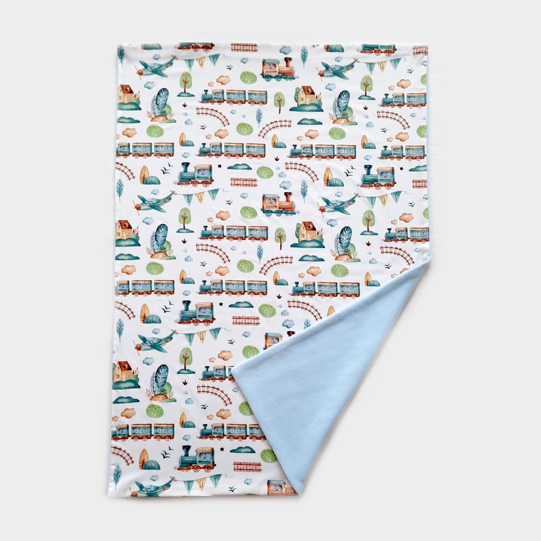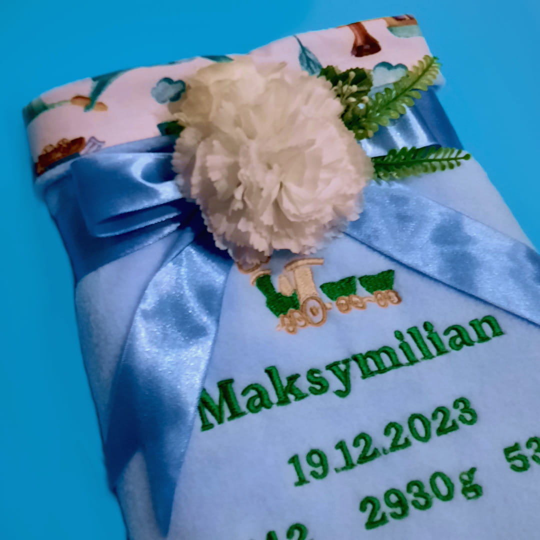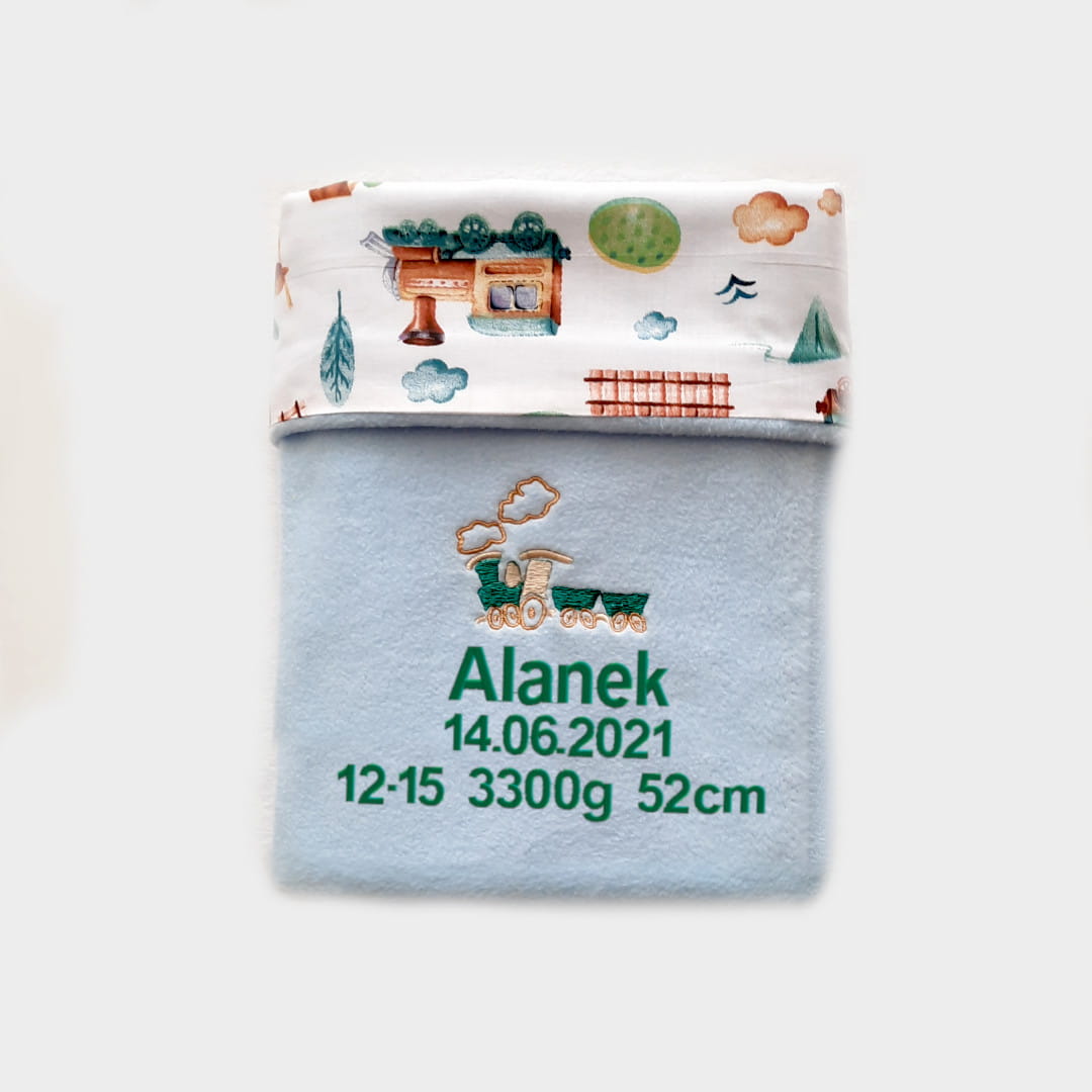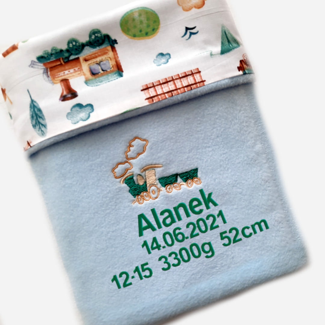 Haft wykonany jest techniką maszynową, zawiera imię i metryczkę dziecka. Rodzaj czcionki i kolor tekstu wybierasz sama. W takim kolorze jak tekst będzie wyhaftowana ciuchcia, ponieważ haft zachowa wizualną spójność i kocyk będzie wyglądał profesjonalnie. Zauważ, że ciuchcia pasuje do nadruków na bawełnie. Ładnie się uzupełniają.