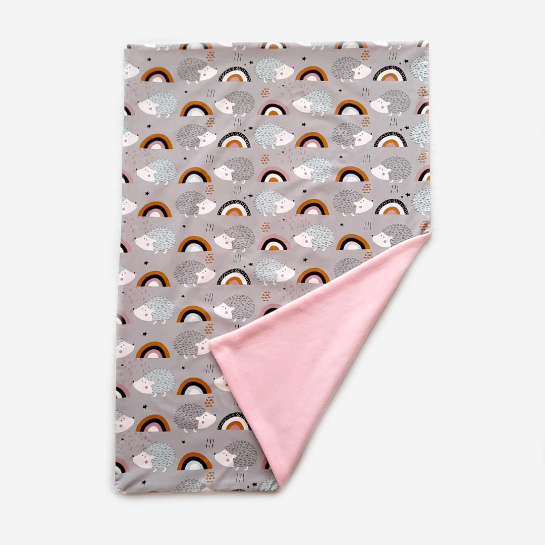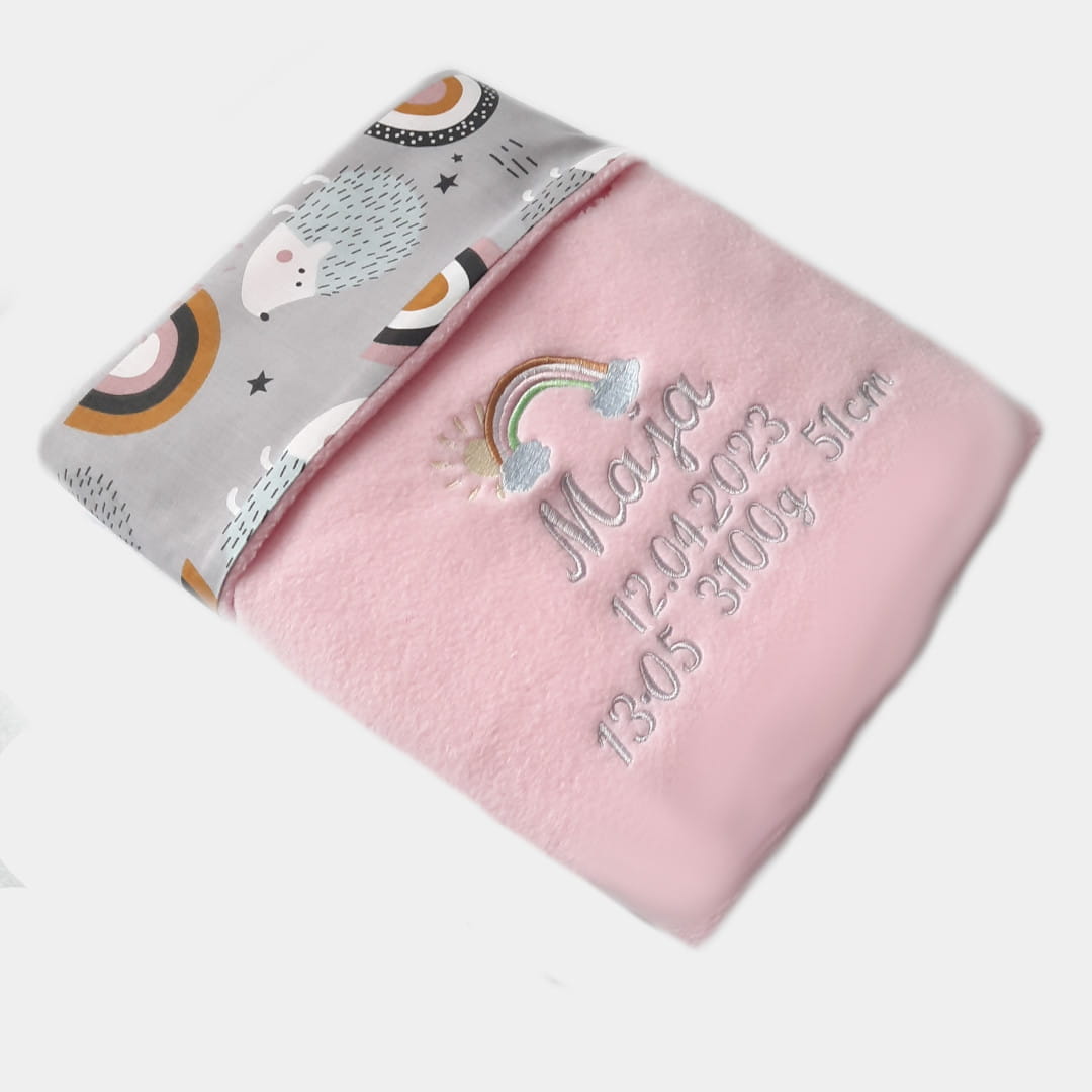 Kocyk z metryczką ma 2 warstwy. Pierwsza-spodnia, to bawełna drukowana w motyw chmurek i jeżyków, druga-wierzchnia to miękki w dotyku polar w jasno różowym kolorze, na którym wyhaftowane jest imię dziecka i jego metryczka, a nad metryczką wyhaftowany jest ładny motyw tęczy z chmurkami.