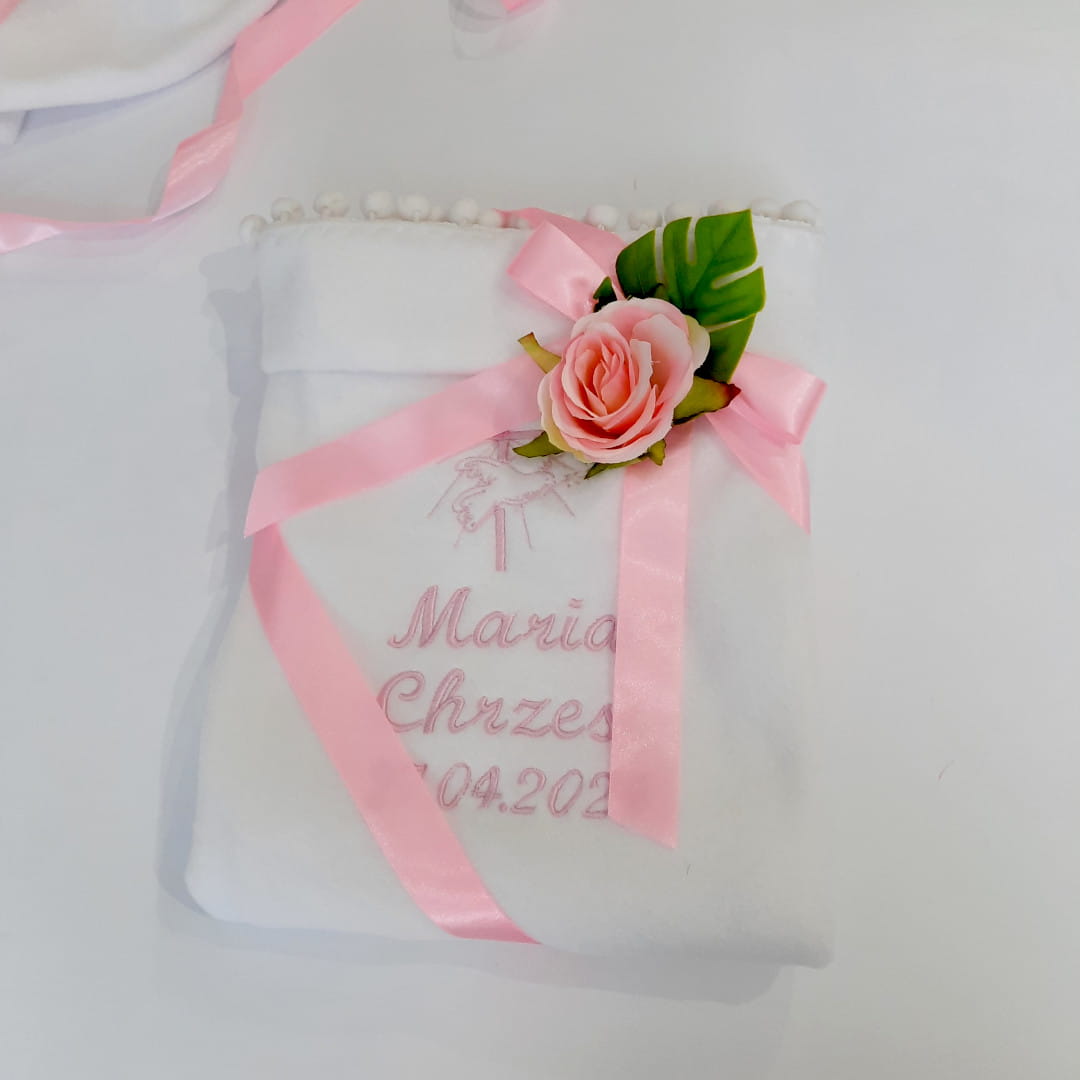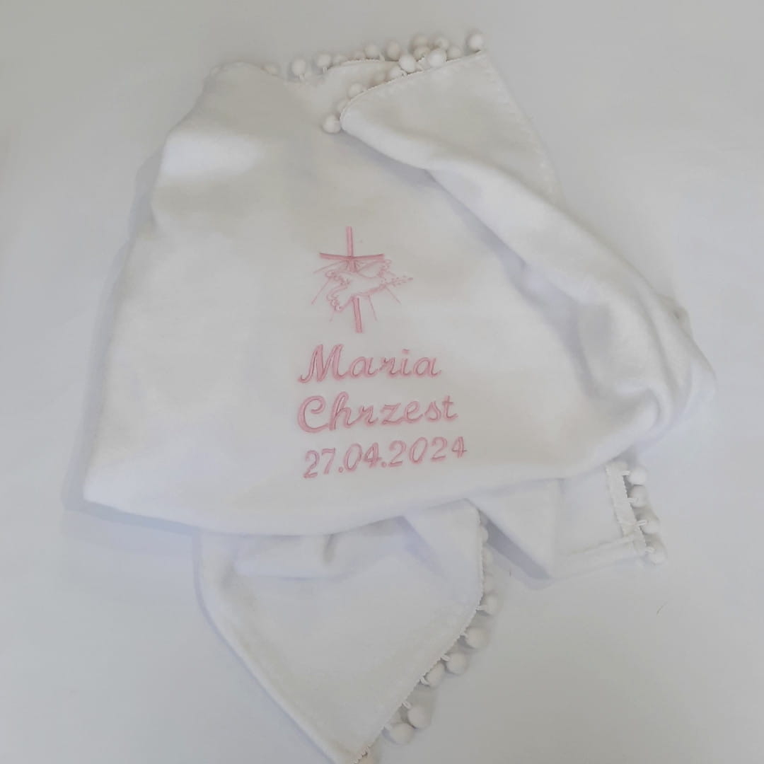 Kocyki wykonane są z białego, miłego w dotyku polaru. Na krótszych bokach ozdabiają go pompony, również w białym kolorze. Na górze kocyka (krótszy bok) umieszczony jest haft w skład którego wchodzi motyw okolicznościowy i imię/imiona dziecka i data chrztu. Kolor haftu możesz wybrać z dostępnej palety barw nici. Kocyk na prezent z okazji chrztu w całości wykonany jest w naszej pracowni.