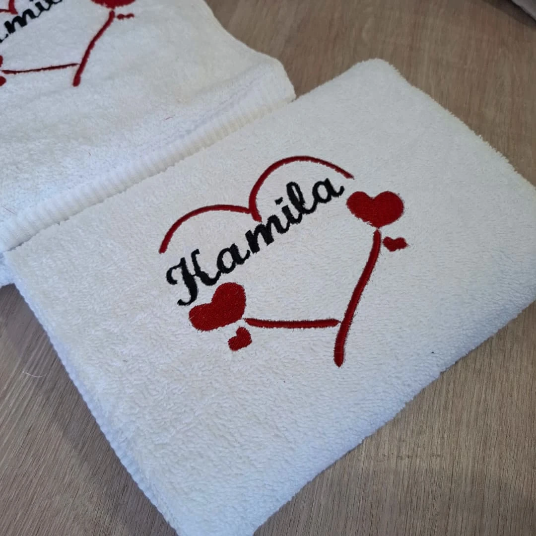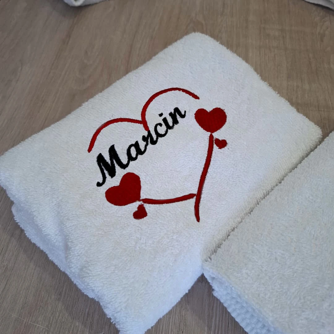 Stwórz wyjątkowy komplet, który łączy estetykę i codzienną funkcjonalność - wybierz personalizowany zestaw ręczników z motywem 5 serc.