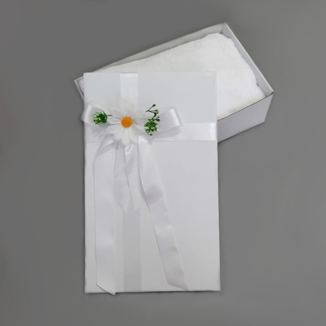 Białe pudełko prezentowe, ozdobione satynowymi, połyskującymi wstążkami i kompozycją florystyczną. Pudełko idealnie będzie pasować do ręcznika w rozmiarze 140x70cm lub kocyka. Solidne ozdobne pudełko wykonane jest z grubej tektury, oznacza to, że gdy włożysz do niego prezenty pudełko nie będzie się wyginać.