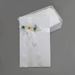 Pudełko prezentowe jest solidne wykonane ze sztywnej 3 warstwowej tektury falistej o grubości 400g/m2. Kolor pudełka biały lekko połyskujący, a w dotyku gładki. Jest to pudełko wielokrotnego użytku do samodzielnego złożenia, otrzymasz w formie płaskiej. Jak widzisz to co wyróżnia pudełko to dekoracyjne wstążki satynowe (połyskujące) białe oraz subtelny kwiatowy dekor.