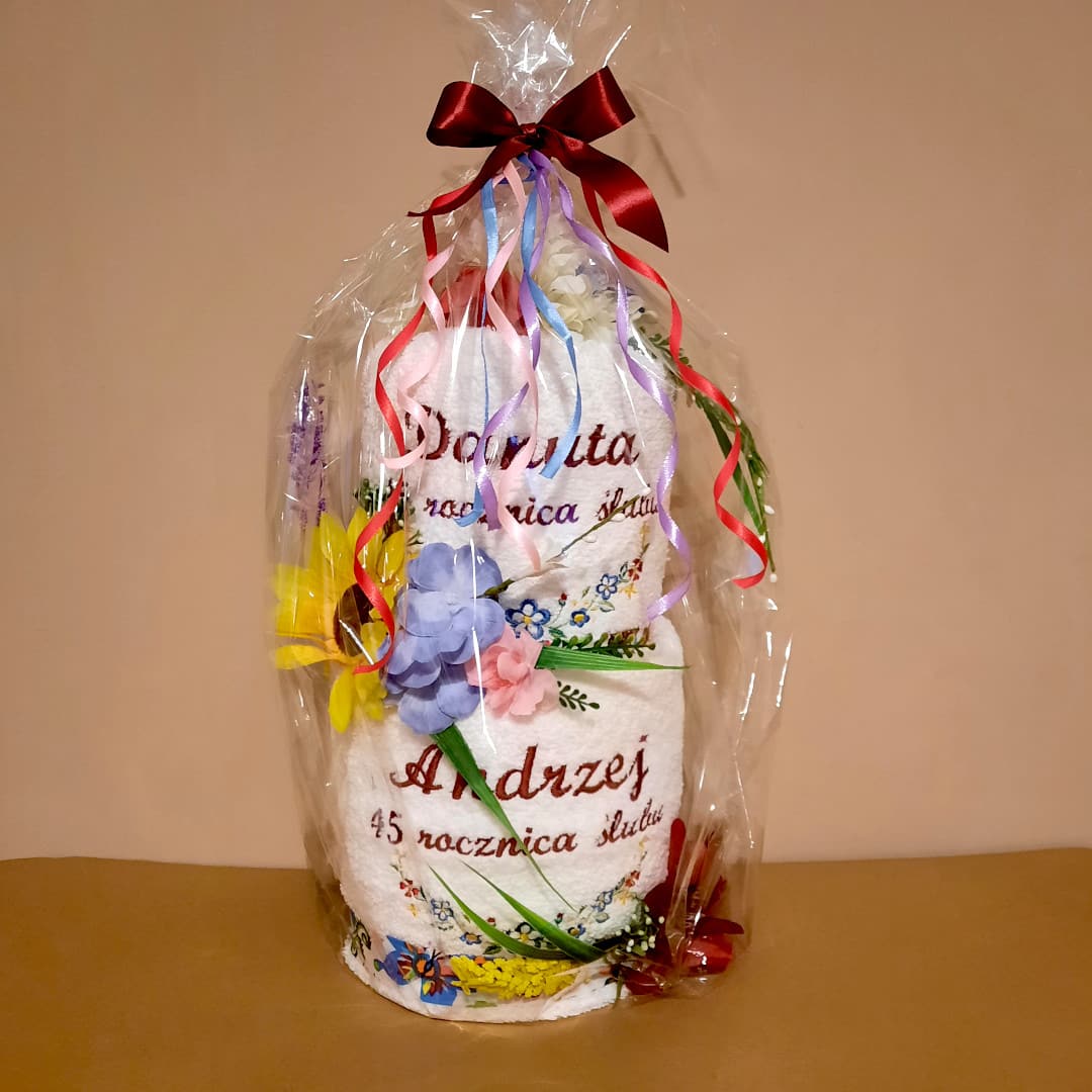 Ręczniki z haftowaną dedykacją i motywem kolorowych kwiatów ułożone kształt bogato udekorowanego tortu, jest idealnym prezentem z okazji rocznicy ślubu i ślubu. Wystarczy dobrać dedykację do odpowiedniej okazji. Taki prezent jest praktyczny i elegancki. Prezent, który wręczymy ukochanym osobom powinien być wyjątkowy, wszyscy o tym wiemy, więc postaw na indywidualny ręcznik z haftowaną dedykacją. Ten tort z ręczników zawsze będzie przypominał Ciebie. Zaprojektuj własny tort wybierając kolory ręczników i dedykacji, odpowiednią czcionkę. Jak widzisz, tort w stylu folk dzięki wielości kwiatów i kolorów wygląda imponująco. Dekoracje dobieramy sami w taki sposób, aby pasowała do wybranych przez Ciebie kolorów ręczników i haftów. Dlatego może ona trochę odbiegać od prezentowanej, np. użyjemy innych rodzajów kwiatów, gałązek zieleni lub wstążek. Miłośnicy ludowych klimatów z pewnością się tu odnajdą. Nie pozostaje nic innego jak podarować gotowy do wręczenia prezent swoim bliskim.