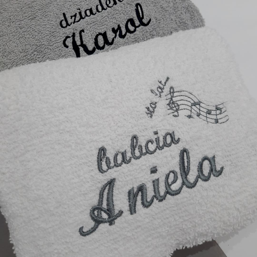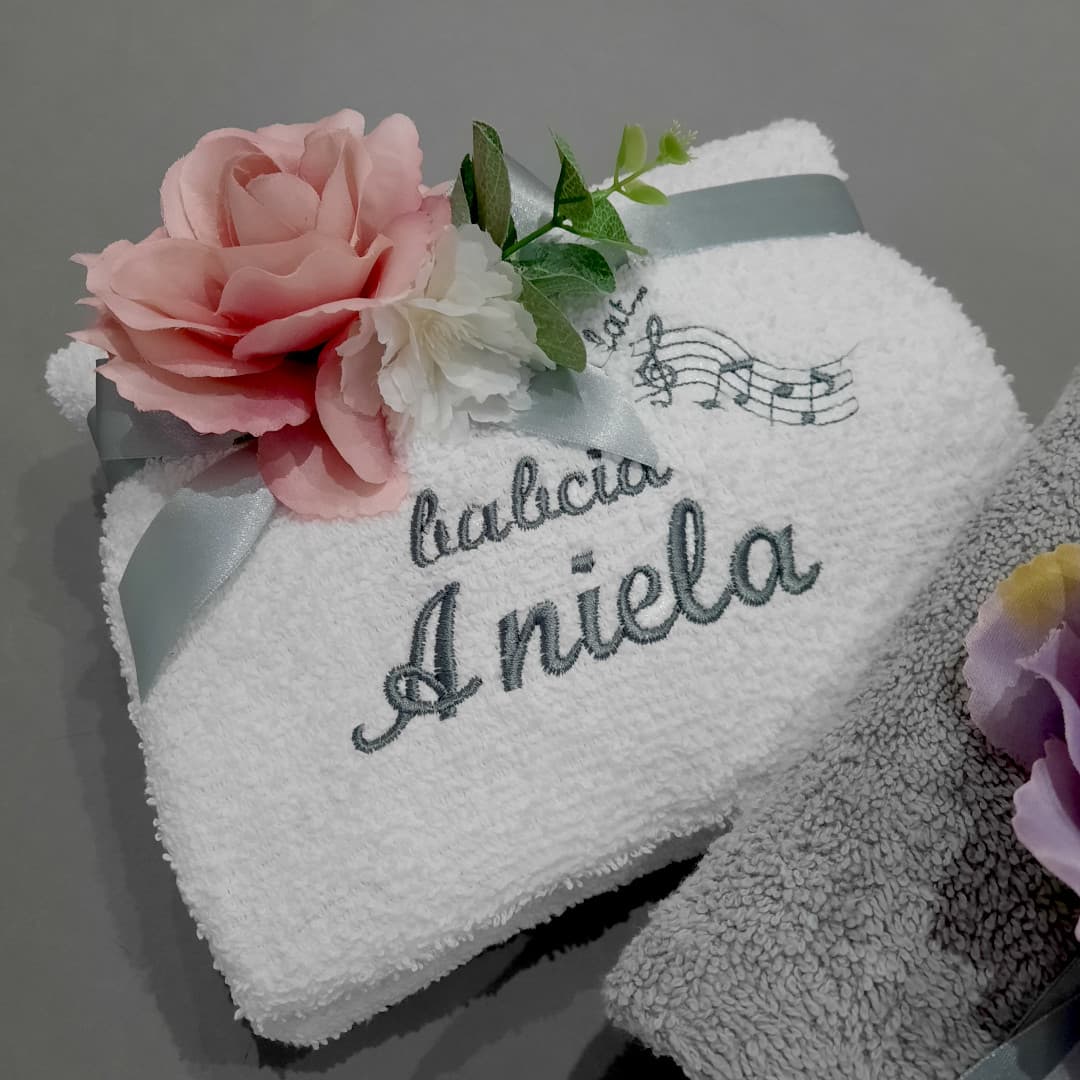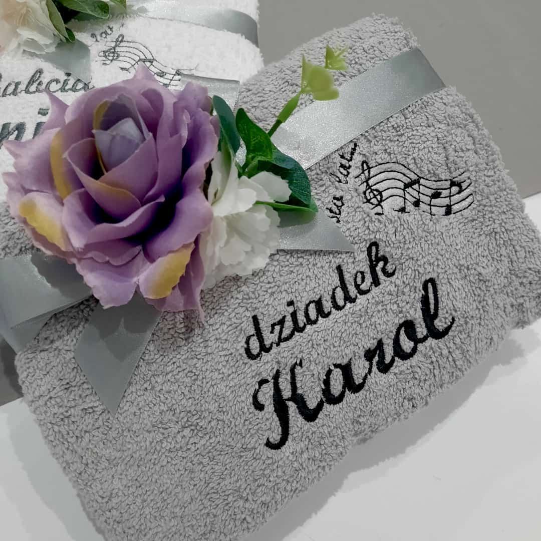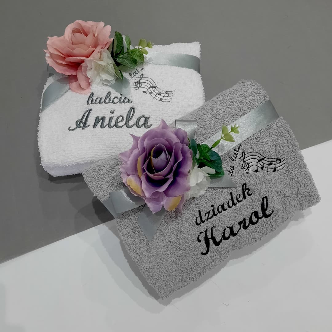 Oto personalizowane prezenty, które możesz podarować swoim dziadkom z okazji ich święta, Dnia Babci i Dnia Dziadka, lub urodzin imienin i świąt. Ręczniki z imionami babci i dziadka są wyjątkowe, ponieważ to Ty, znając najlepiej swoich dziadków, wybierasz ich ulubione kolory ręczników i haftów. Haft składa się z imienia lub krótkiej dedykacji do 3 wyrazów i motywu nutek na pięciolini. Wybierając dodatkową opcję otrzymasz elegancki i gotowy do wręczenia prezent. Udekorujemy wybrany ręcznik kwiatami i kokardami oraz zapakujemy wysoko przezroczystą folię.