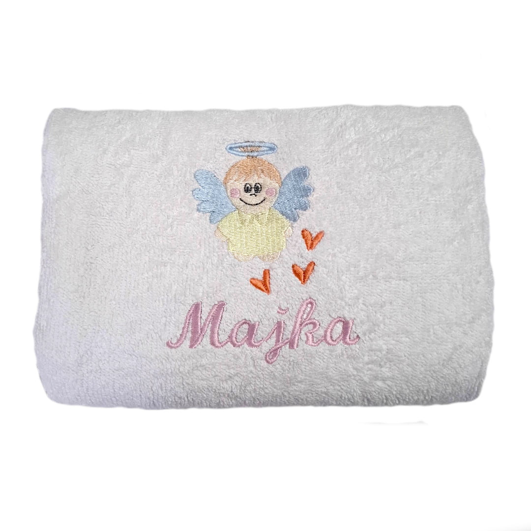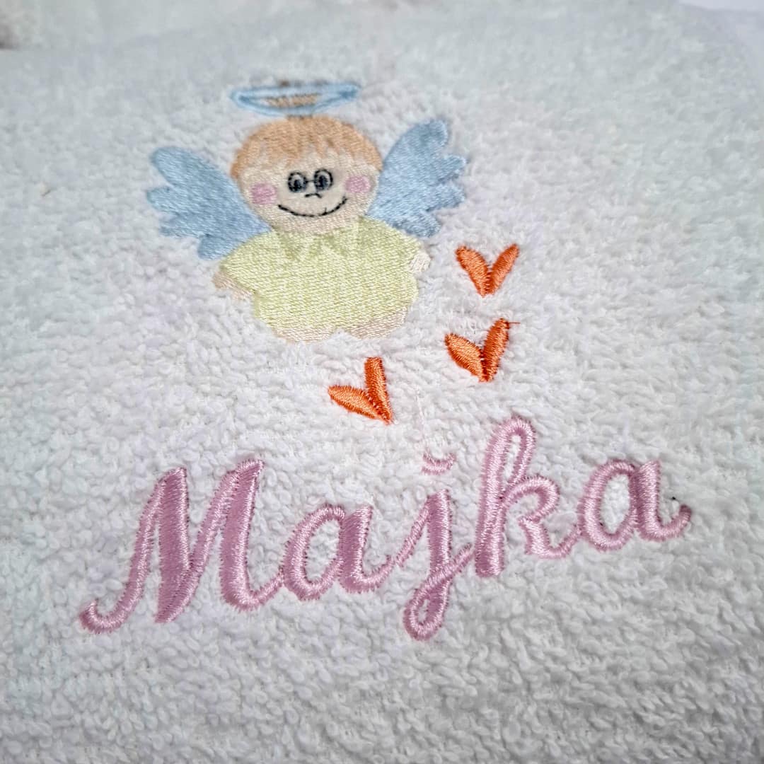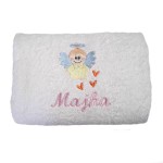 Ręcznik dla dziecka z haftowanym imieniem i motywem aniołka.