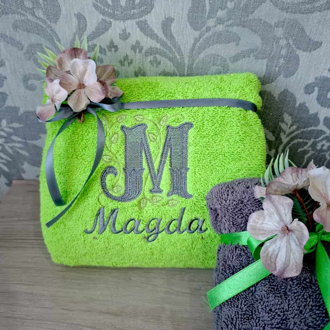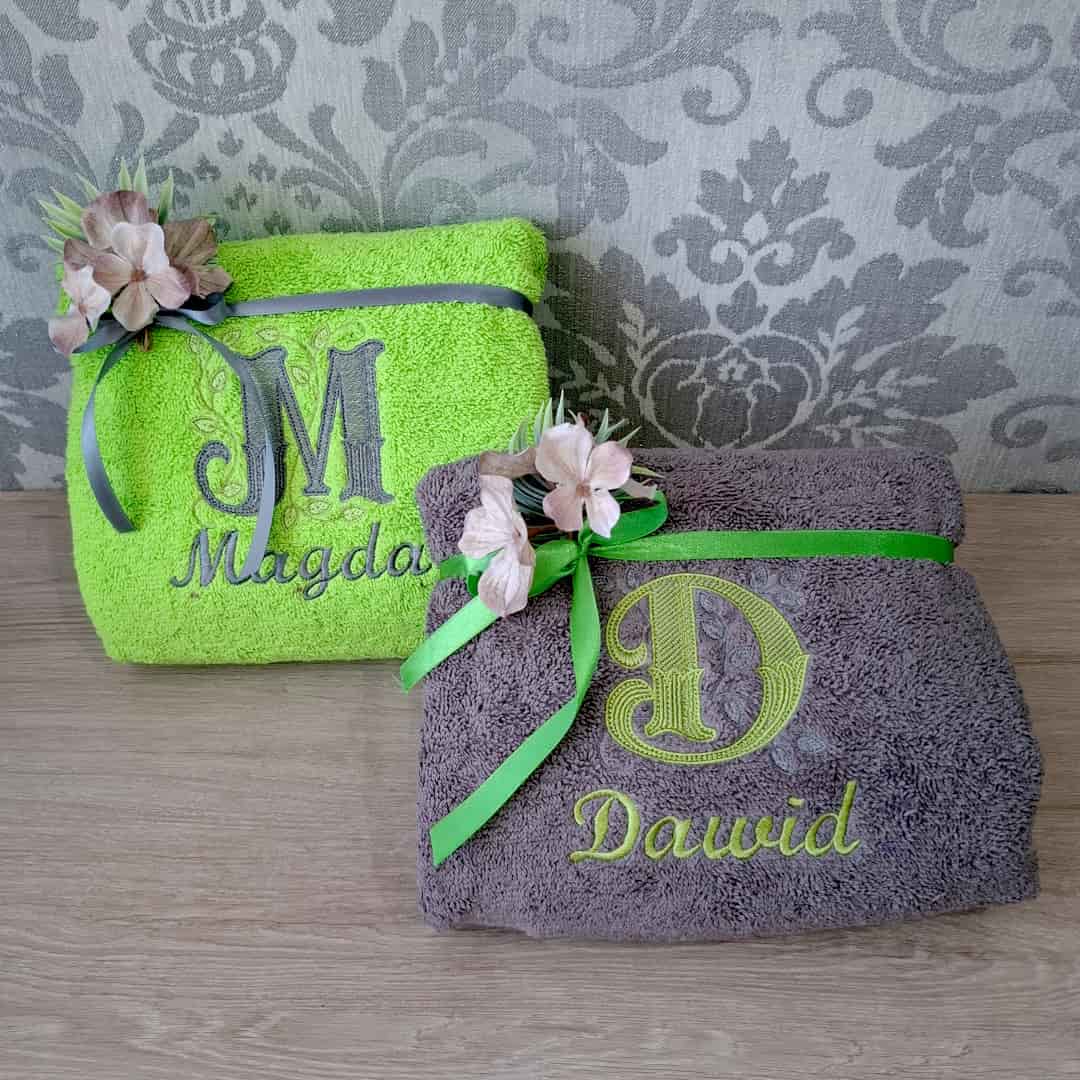 Szukasz prezentów dla bliskich osób, które zapadną każdemu w pamięć? Personalizowany ręcznik z haftowanym imieniem i ozdobną literą, której subtelności dodaje delikatny motyw winorośli w tle. Prezentowane ręczniki zrobione zostały z myślą o Magdzie i Dawidzie. Kolorystyka ręczników i przeciwne kolory haftów stanowią piękną jedność. Otrzymali dwa kąpielowe, bawełniane, puszyste ręczniki, które ozdobione są delikatną satynową wstążką i sztucznymi kwiatami, ponieważ miał być to prezent, który od razu będzie podarowany parze bez konieczności szukania opakowań i paczek prezentowych…. ot..taka wygoda:) Do tego jest to prezent 2w1: łądny i praktyczny. Czy takiego prezentu szukasz? A może podarujesz go sobie?