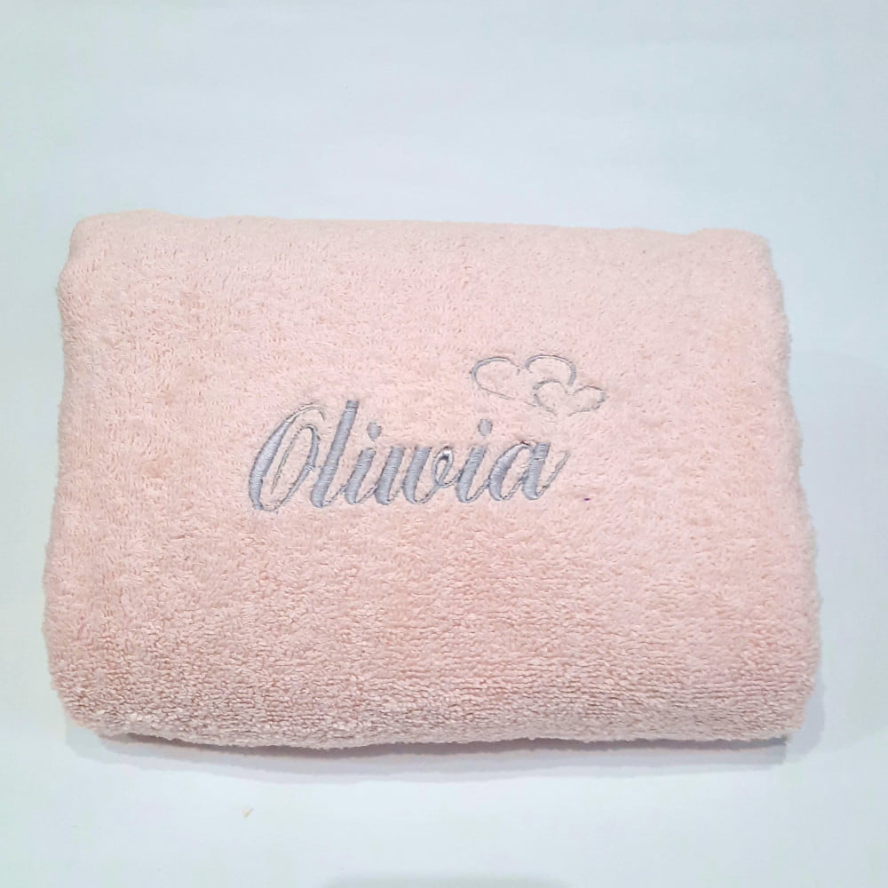 Haft umieszczony jest w dolnej części ręcznika (na środku krótszego boku). Układ haftu jak na zdjęciu: tekst, w tym przykładzie imię i motyw serduszek. Imię haftowane jest czcionką pisaną, ale możesz wybrać inną z dostępnych. Wysokość najwyższego znaku to ok.3cm. Kolor całego haftu (tekst i motyw) wybierasz z dostępnej palety barw. Jeżeli uznasz, że wolisz aby kolory motywu i tekstu były różne napisz mi o tym.