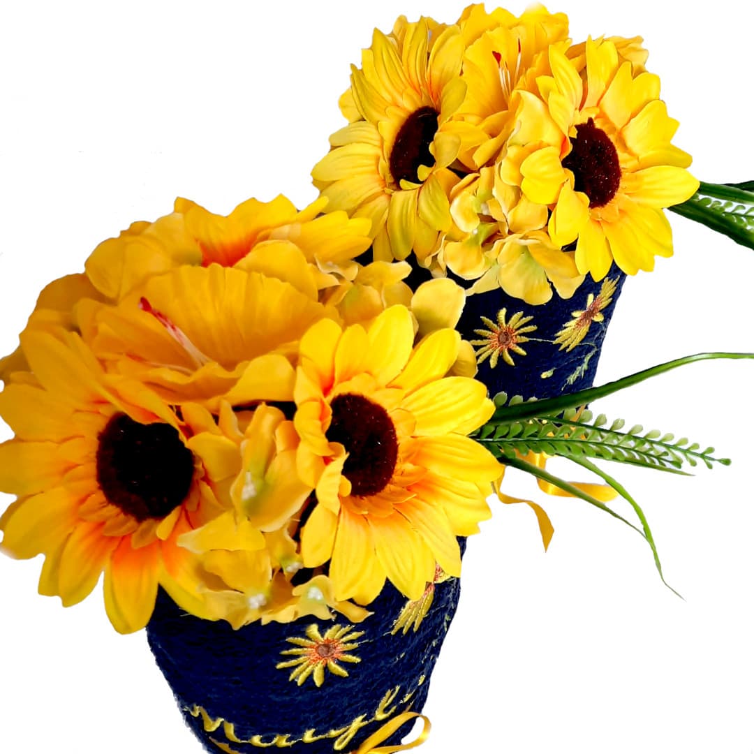 - dekoracja to satynowe tasiemki, kwiaty słonecznika dopasowane do haftowanego motywu oraz kilka gałązek zieleni. Aby otrzymać gotowy do wręczenia prezent możemy zapakować go w celofan i ozdobne kokardy, wystarczy, że zaznaczysz "prezentowe pakowanie".